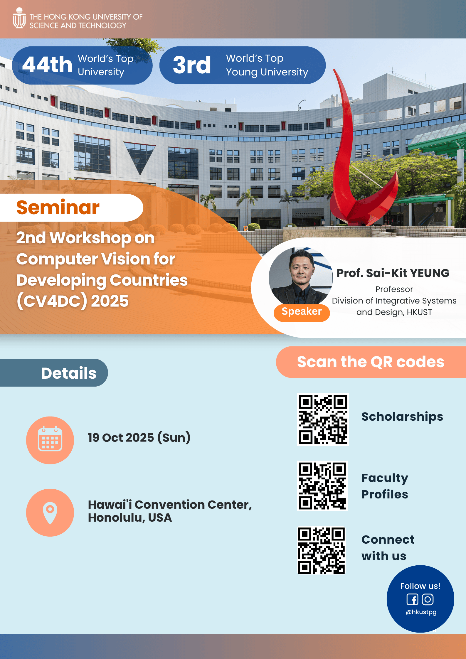 Breadcrumb Home events seminar 2nd workshop computer vision developing countries cv4dc 2025 prof sai kit yeung Seminar on 2nd Workshop on Computer Vision for Developing Countries (CV4DC) 2025 by Prof. Sai-Kit Yeung Date: 19 Oct 2025 (Sun) Venue: Hawai'i Convention Center, Honolulu, USA